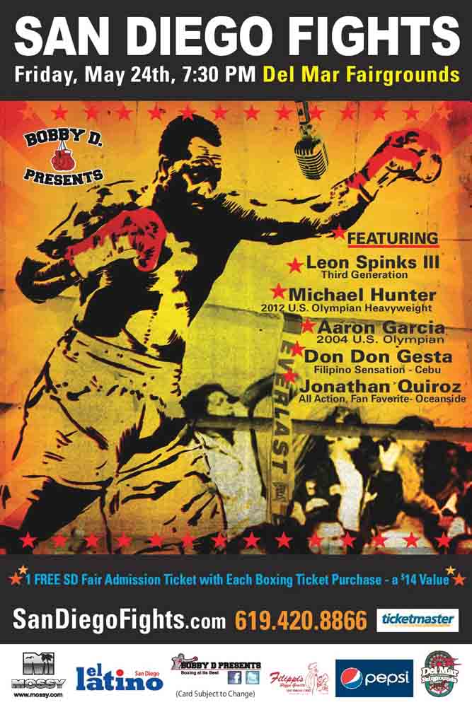 SAN DIEGO, CA – With two mega fight cards under its belt this year, San Diego’s premier boxing promoter, Bobby D Presents, will now stage its biggest event to date this year on Friday, May 24th, when “San Diego Fights” makes its debut at the historic Bing Crosby Hall at the Del Mar Fairgrounds. Known for its all-action bouts filled with explosive match-ups, Bobby D Presents boss Bobby DePhilippis guarantees that the upcoming card, the first of seven exciting monthly shows scheduled at the fairgrounds this year, will be no different. As an added bonus, fight fans will receive one FREE 2013 San Diego County Fair admission ticket with every boxing ticket purchased, a value of $14.