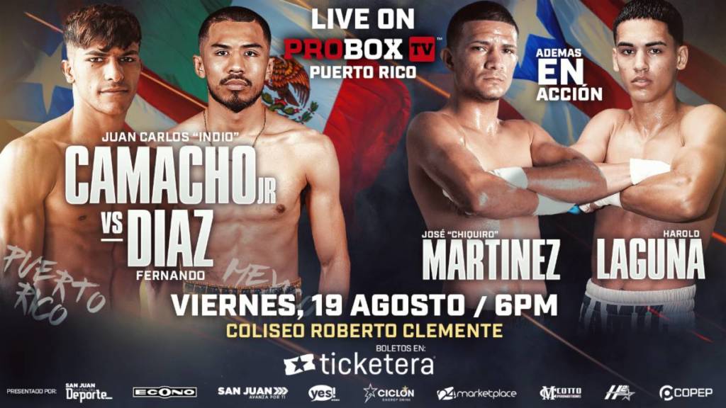 También en acción y haciendo su regreso el contendor al campeonato mundial José ‘Chiquiro’ Martínez (21-1-3, 14KOs) mientras que Pedro ‘Pedrito’ Márquez (13-1, 9KOs), el orgullo de Guaynabo Puerto Rico, Harold Laguna (5-0, 4KOs), Jan Paul Rivera (3-0, 3KOs) y Christian ‘El Campesino’ Soto (3-0, 3KOs) estarán en el ring en una noche llena de acción de los mejores prospectos de Puerto Rico. PROBOX TV es presentado por Miguel Cotto Promotions en asociación con H2 Entertainment junto al l Municipio de San Juan y Supermercados Econo.