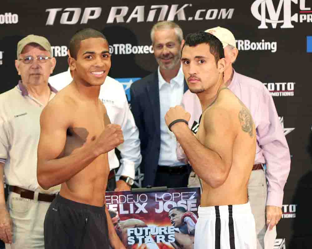 Caguas, PUERTO RICO – El puertorriqueño Félix ‘el Diamante’ Verdejo (14-0, 10KO) -izquierda- derrotó por amplia decisión unánime a Oscar Bravo (21-6, 9 KO) -derecha- de Chile. Los tres jueces anotaron 80-72.