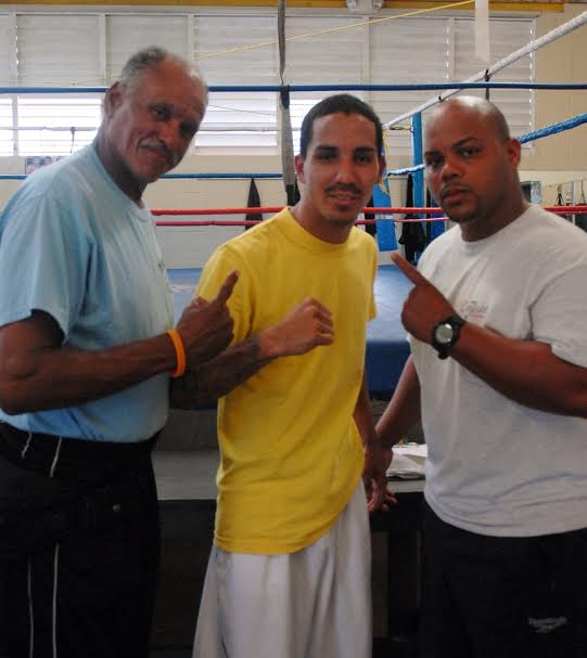 (De izquierda a derecha) Jim Pagán (Entrenador), ‘Manny’ Rodríguez, y Víctor Cotto (Preparador Físico)