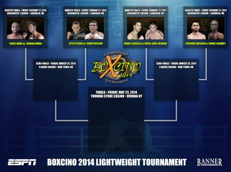 PHILADELPHIA (FEBRUARY 3, 2014)--Matchups for the Boxcino 2014 tournament, a new boxing tournament presented by Banner Promotions, that will air on ESPN Friday Night Fights presented by Corona Extra and ESPN Deportes’ Noche de Combates presented byCorona Extra, were announced on this past Friday’s edition of Friday Night Fights andNoche de Combates.