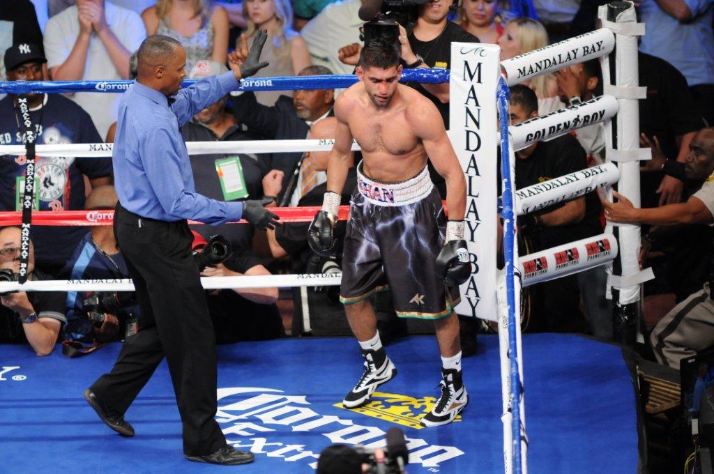 Khan se coronó campeón superligero de la AMB, cuano le arrebató el título al santafesino Marcos “Chino” Maidana en un ajustado fallo del jurado en diciembre de 2010 en Las Vegas, y lo resignó un año después en Washington ante el local Lamont Peterson.
