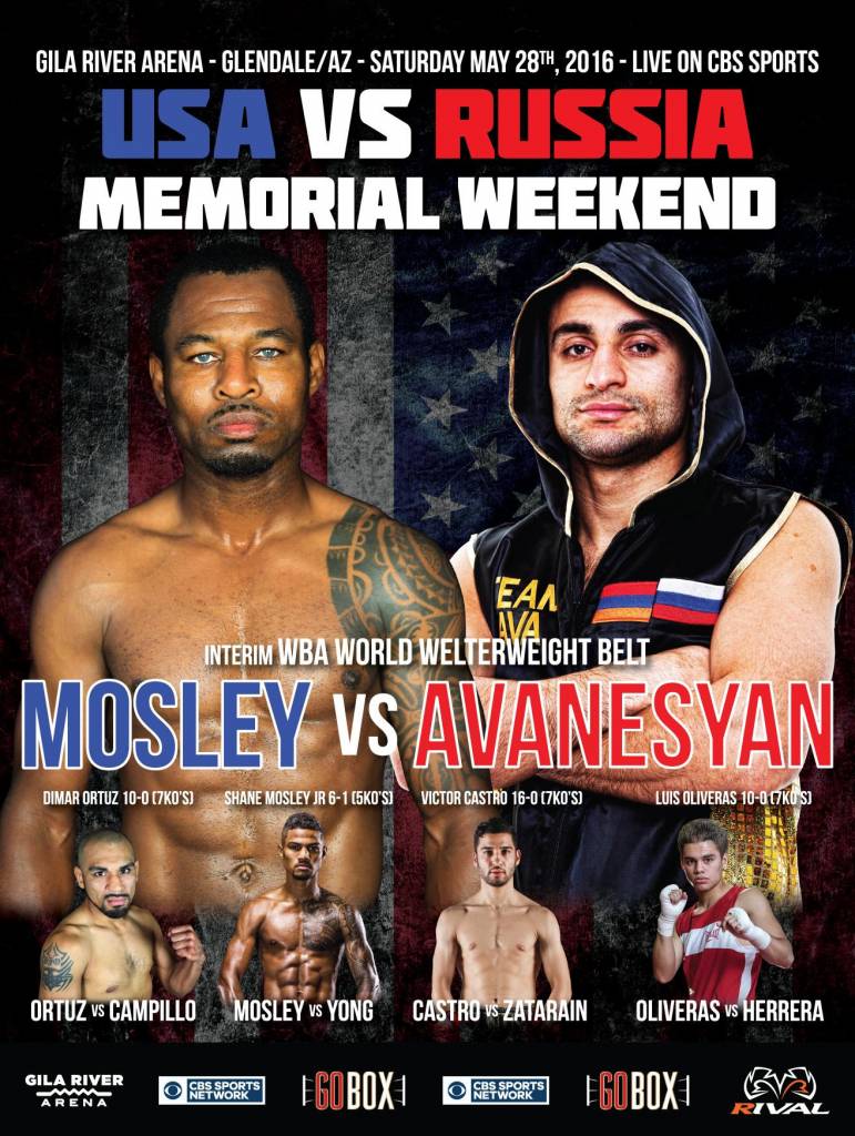 En Glendale, Ariz. (CBS Sports Net): David Avanesyan vs. Shane Mosley, 12 rounds, por el título interino peso welter de la AMB en poder de Avanesyan; Victor Castro vs. Carlos Zatarian, 8 rounds, ligero; Dimar Ortuz vs. Ricardo Campillo, 8 rounds, crucero; Shane Molsey Jr. vs. Roberto Young, 6 rounds, súper mediano; Clay Burns vs. Isaac Avalos, 4 rounds, ligero; Luis Oliveras vs. Manuel De Los Reyes Herrera, 6 rounds, welter; Luis Rose vs. Jose Jesus Hurtado, 6 rounds, súper mediano.