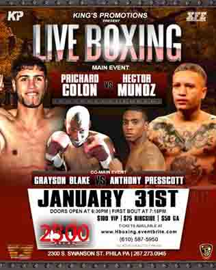 En Filadelfia, Pa.: Prichard Colon vs. Héctor Muñoz, 8 rounds, pesos junior medianos; Grayson Blake vs. Anthony Prescott, 6 rounds, junior medianos; Raynell Williams vs. Ryan Picou, 6 rounds, ligeros; Kyrone Davis vs. Jonathan Garcia, 6 rounds, medianos; Stephen Fulton vs. Eric Gotay, 6 rounds, junior plumas; Earl Newman vs. Yuwshua Zadok, 4 rounds, cruceros; Caleb Plant vs. David Lopez, 4 rounds, medianos; Jamatay Clark vs. Dominique Foster, 4 rounds, welters; Robert Irizarry vs. Luis Acevedo, 4 rounds, plumas; Willie Jones vs. Moises Rios, 4 rounds, welters; Antonio Russell vs. Gabriel Braxton, 4 rounds, gallos.