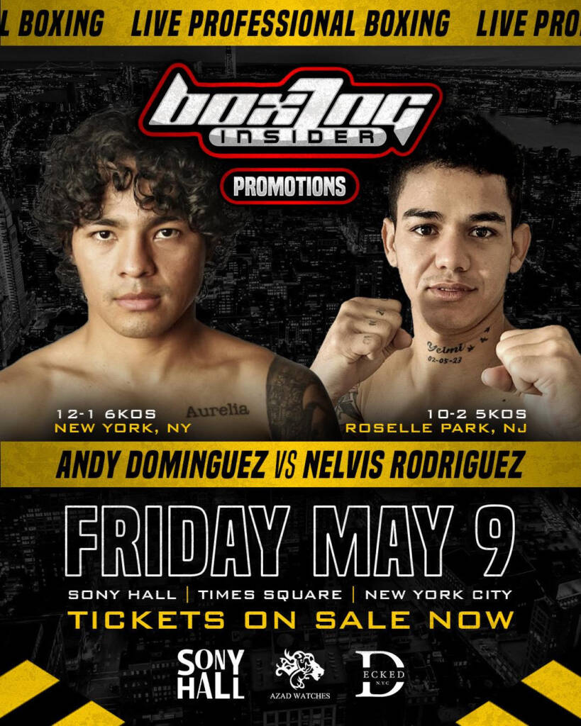 El evento principal cuenta con un enfrentamiento de peso mosca de 10 asaltos entre el favorito Sony Hall Andy Domínguez (12-1, 6 KOs) y Nelvis Rodríguez (10-2, 5 KOs). Andy es uno de los favoritos de la afición neoyorquina y hace su quinta aparición en la serie Boxing Insider at Sony Hall.