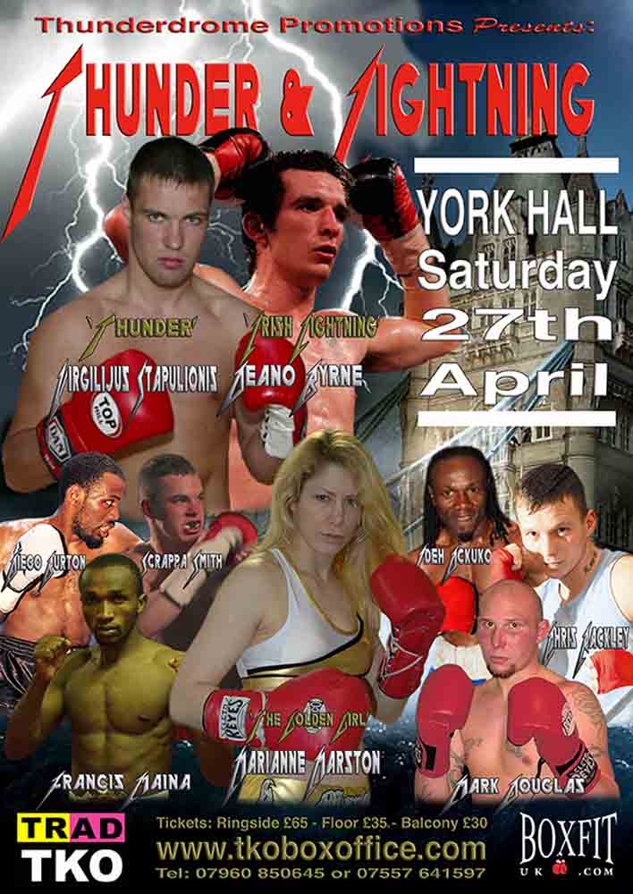 Dean ‘Irish Lightning’ Byrne versus Jay ‘IOW Assassin’ Morris, for the International Masters Welterweight Championship, headlines Dave Murphy’s Thunderdrome Promotions ‘Thunder & Lightning’ event at York Hall, Bethnal Green in London on the 27th April 2013.