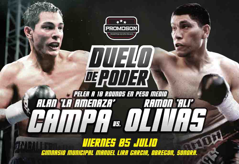 El intenso choque entre Campa y Olivas será el respaldo principal de la función del próximo viernes en el Gimnasio Municipal de Obregón, estelarizada por la contienda entre Fernando Cárcamo (12-5-0, 9 ko’s) y Ramiro Alcaraz (12-2-1, 7 ko’s) a 10 rounds en peso Ligero.