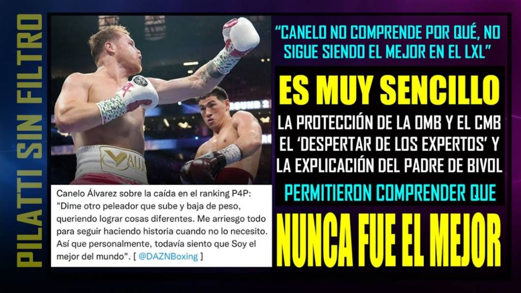 Canelo no se explica su caída en el LXL e insiste con ser el mejor del mundo. Sin embargo, lo desmiente el aluvión de cambios, algunos sorprendentes, en los nuevos LXL, así como la inexplicable protección de la OMB que lo declaró super campeón o el CMB que lo considera héroe nacional y lo peor, como lo veremos en este video, la descripción con peras y manzanas del padre de Bivol al peor defecto en el boxeo de Canelo Alvarez. Un defecto que aprovechó Dmitry para ganar a media máquina y que “incomprensiblemente” ningún rival anterior del campeón mexicano quiso o supo aprovechar. Bienvenidos a otro video Sin Filtro ni anestesia.