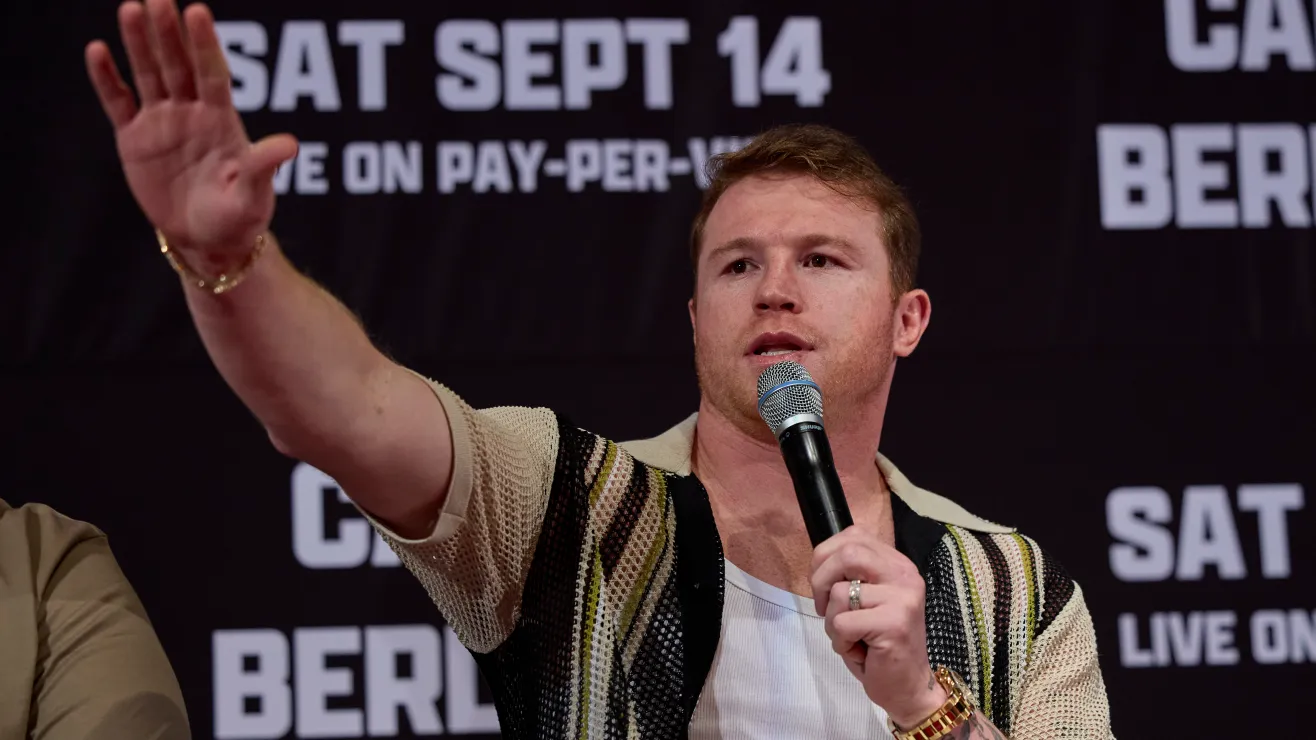 Canelo Álvarez durante la rueda de prensa de su combate ante Edgar Berlanga. Crédito: Esther Lin / Premier Boxing Champions | Cortesía
