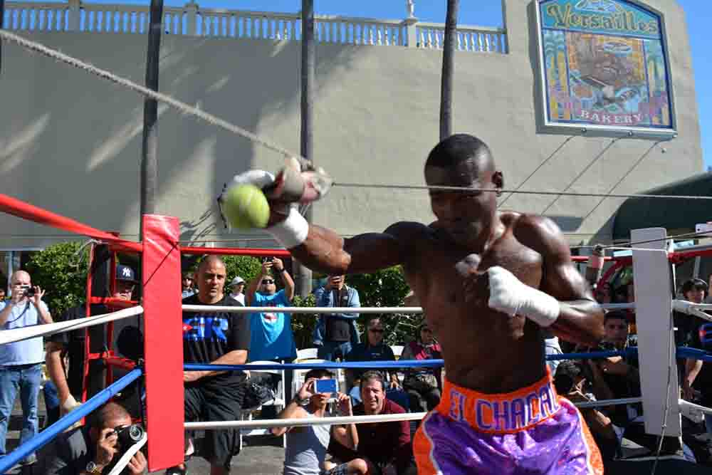 Caribe Promotions and Versailles Cuban Restaurant held court with media and fans to showcase 2X Cuban Olympic Gold Medalist , WBA,WBO and The Ring Magazine Pound 4 Pound King Jr. Featherweight, the undisputed and undefeated Super World Champion Guillermo “El Chacal” Rigondeaux at an outdoor open workout . Versailles Restaurant (commonly referred to as simply Versailles), cafeteria, restaurant, and bakery, is a landmark eating establishment located on Calle Ocho (8th St) in Little Havana, Miami. Versailles is a popular place for Cuban food and social gatherings and for decades, Versailles has been also ground zero for the Cuban-American exile community in South Florida. The restaurant has been a gathering point for anti-Castro protesters and the press covering those events.