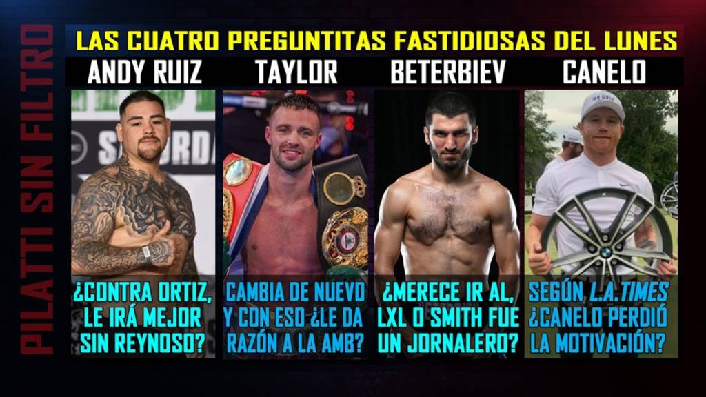 Lunes de preguntas fastidiosas, con la duda sobre la motivación actual para el boxeo del “millonario golfista” Canelo Alvarez (02:49), Andy Ruiz sin Reynoso y con nuevo entrenador (08:30), Josh Taylor otra vez cambia planes (12:10) y la discusión de las redes sociales: el lugar que Beterbiev debe ocupar o no ocupar en el LXL (15:31). Bienvenidos a otro video Sin Filtro y Sin Rodeos.