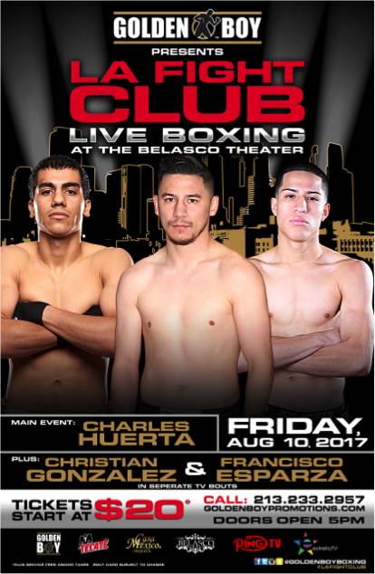 LOS ANGELES (July 7, 2017) Fans were stunned when Charles Huerta (19-5, 12 KOs) scored a massive upset in a third round knockout over Ivan Delgado on the April 14th edition of LA FIGHT CLUB. Now, the proud Paramount, CA native will look to draw even more masses as he steps up to take on a soon to-be-announced opponent on August 10 in an eight-round super featherweight fight from the Belasco Theater televised live on Estrella TV’s Boxeo Estelar.