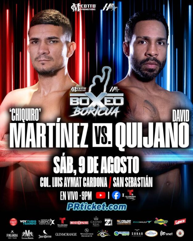 En un combate que promete gran acción el cuál será en la división gallo; José ‘Chiquiro’ Martínez chocará ante el veterano cagueño David Quijano en el ring de Boxeo Boricua “estamos entrenando al cien por ciento para esta pelea, conocemos bien a David Quijano, pero como dicen por ahí el 9 de agosto nos vamos a sacar los cantos. Estoy loco por pelear y demostrar que queda Chiquiro Martínez para rato. Me siento super emocionado de pelear en San Sebastián pues es como pelear en mi casa, así que los espero a todos el 9 de agosto en el Coliseo Luis Aymat”, finalizó Martínez.