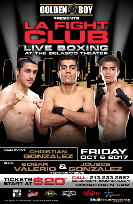 González vs. TBA es un combate a seis asaltos en peso ligero presentado por Golden Boy Promotions y patrocinado por Tecate “Born BOLD” y Casa México Tequila. El evento se llevará a cabo el viernes 6 de octubre en el Belasco Theater. Las puertas se abren a las 6:00 p.m. PT. La primera pelea y la transmisión de Ring TV comenzará a las 6:15 p.m. PT. La transmisión de Boxeo Estelar iniciará a las 10:00 p.m. ET/7:00 p.m. PT, y también por EstrellaTV.com y YouTube a través de LBI Media, Inc.’s Fenómeno Studios. Marque su calendario y compre boletos por adelantado antes que se agoten para los eventos de LA FIGHT CLUB 3 de noviembre y 1 de diciembre.