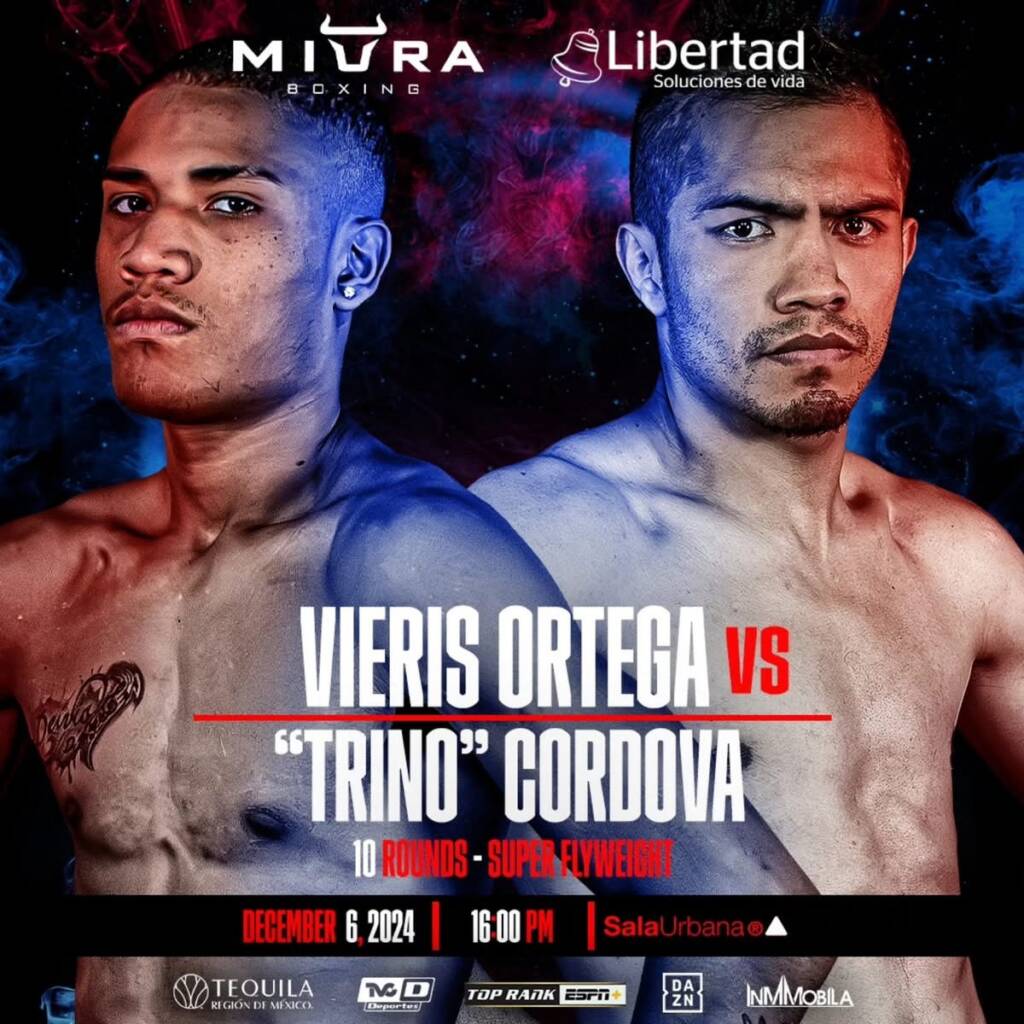 Con el apoyo de Libertad Soluciones de Vida, Tequila Región de México e Inmmobila, el cartel que podrá ser visto a través de ESPN+ en Estados Unidos y Canada y por DAZN en México y el resto del mundo a partir de las 18:00 horas CST y por TVC Deportes en Mexico a partir de las 20:30 hora local, contará en sus turnos estelares con la presentación del espectacular púgil colombiano Vieris Ortega, quien se medirá a un aguerrido boxeador como lo es el caitalino José “Trino” Córdova, en un duelo que promete estar repleto de emoción y adrenalina.