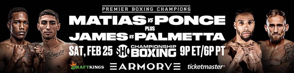 Matías vs. Ponce verá a dos contendientes top del peso super ligero como el popular artista del nocaut boricua Subriel Matías y el argentino invicto Jeremías Ponce cara a cara por el título vacante del Campeonato Mundial de la FIB en la división de las 140 libras el sábado, 25 de febrero encabezando al evento de Premier Boxing Champions en vivo por SHOWTIME desde el Armory de Minneapolis.