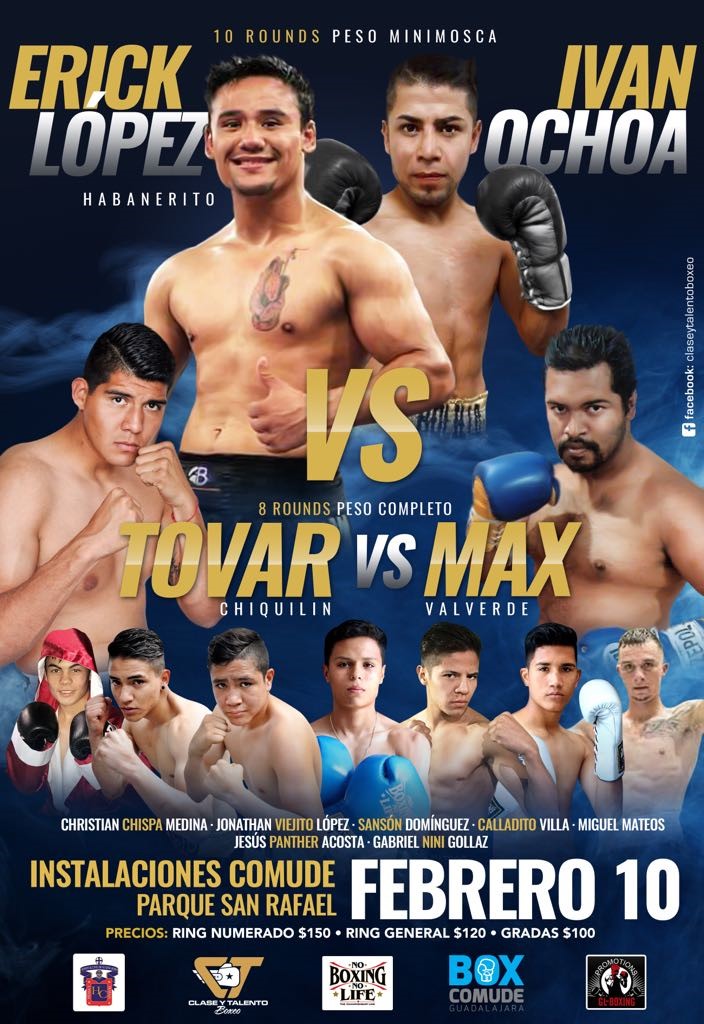 Las promesas jaliscienses Erik “Habanerito” López, pupilo de Rigo “Español” Alvarez, hermano del “Canelo” Alvarez, y el recio pegador Filiberto “Chiquilín” Tovar, campeón pesado de la Fecombox, entrarán en acción contra distintos oponentes, en la primera función de 2018 de Clase Talento y Boxeo, el 10 de febrero en el gimnasio Panamericano del Comude de Guadalajara.