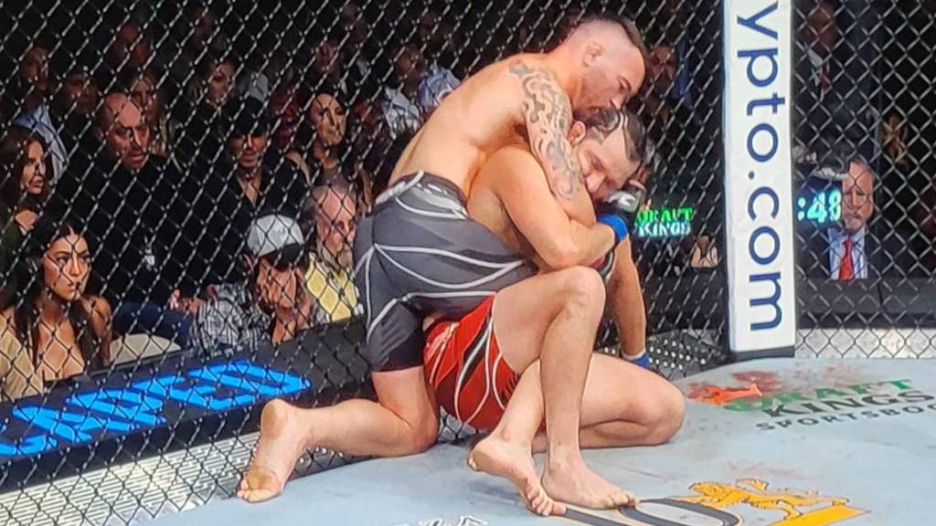 Masvidal asustó al rival con una patada voladora en los primeros segundos de la pelea. Jorge atacó la pierna delantera de su rival, mientras que Colby lanzó una serie de ganchos y luego fue al clinch por debajo de la red. “Gamebred” aguantó mucho tiempo, pero terminó aterrizando en la lona. Covington buscaba una hebilla a la espalda, y también amenazó con aplicar presión. El “Caos” estabilizó al rival sentado bajo la red. El ex campeón interino de peso welter entregó golpes cortos mientras trabajaba activamente para su sumisión. Colby se movió para montar por un momento, pero un momento después, Masvidal logró escapar al cuello alto.
