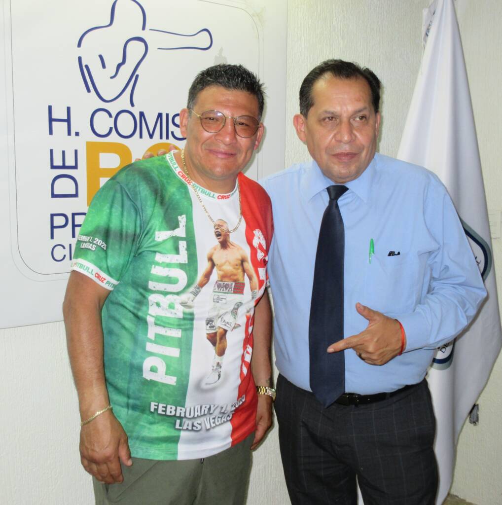 El Comisionado, Rodolfo Rosales (derecha), así como el pleno del organismo boxístico informaron lo anterior y expresaron total apoyo a la segunda función de boxeo que hará la naciente promotora Perros Demoledores, que encabeza el ex boxeador Isaac Cruz (izquierda).