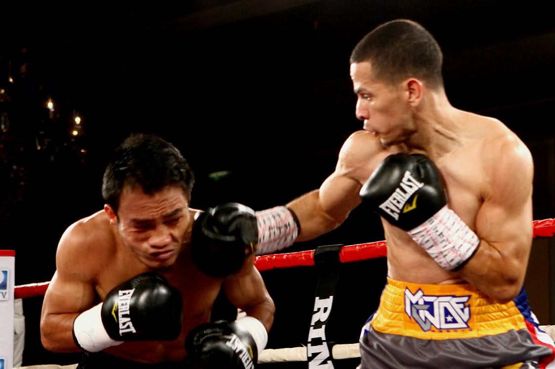 McJoe Arroyo conecta con un gancho de derecha al filipino Mark Geraldo durante el duel del sábado. (Suministrada/José Pérez-PRBB)