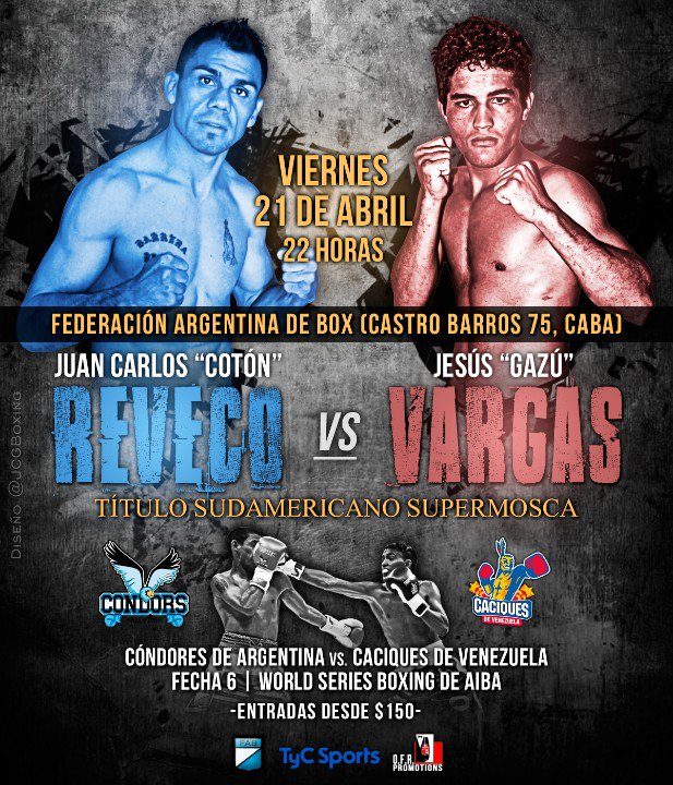 En el combate estelar de la noche, el talentoso mendocino y ex campeón mundial minimosca y mosca AMB, Juan Carlos “Cotón” Reveco (37-3-0, 19 KO), se medirá con el venezolano oriundo de Caracas, Jesús “Gazú” Vargas (15-8-1, 11 KO), donde estará en juego la corona sudamericana de la división supermosca, que se encuentra vacante, en duelo pactado a la distancia de doce asaltos de 3×1.