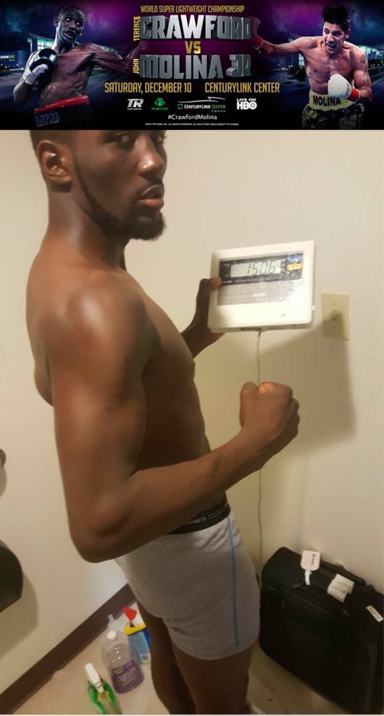 El campeón superligero del Consejo Mundial de Boxeo, Terence Crawford (29-0, 20 KOs) se reportó en excelentes condiciones, al registrar un peso de 150.6 libras a poco menos de un mes del combate que sostendrá contra el mexicoamericano John Molina Jr. (29-6-23 KOs), el próximo 10 de diciembre en el CenturyLink Center de Omaha, Nebraska y que será televisado por HBO para los Estados Unidos.