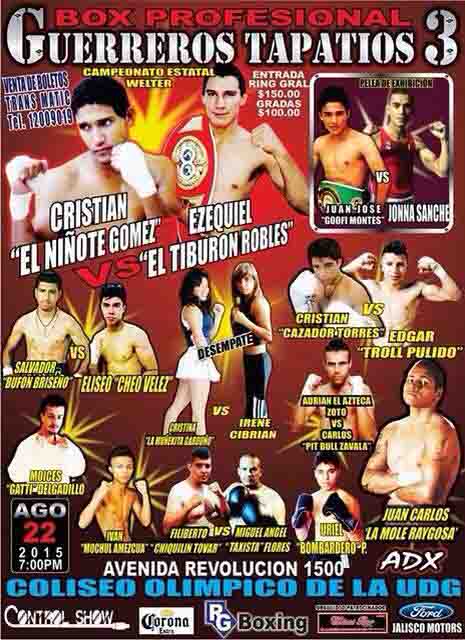 En el turno estelar de la atractiva cartelera, los jalisciense Cristian “Niñote” Gómez y Ezequiel “Tiburón” Robles sostendrán un interesante combate, cuyo principal ingrediente será el orgullo, pues ambos saltaran al encordado con el deseo de conservar su racha invicta y conquistar el campeonato estatal de peso welter que estará en juego.