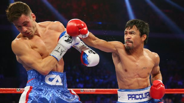 El filipino ganó por decisión unánime con tarjetas 120-102 una y 119-103 dos, hubo 6 konck downs contra Algieri, tres antes del 9no: uno regalado por el referí, uno dudoso y el 3ero legítimo; en el capítulo 9, Pacman sorprendió a Algieri con un zurdazo y el perdedor cayó por otra cuenta de protección, se paró en malas condiciones y recibió una andanada de golpes que obligó al referí a una más de pie, pero Algieri capeó el temporal, si cabe, logró escapar del nocao y terminar el round huyendo.