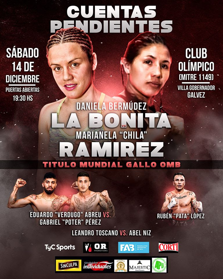 En el pleito que encabeza el festival, denominado “Cuentas Pendientes”, estará en juego el título mundial gallo de la Organización Mundial de Boxeo (OMB), que expondrá por cuarta ocasión una de las mejores pugilistas libra por libra de la actualidad y Firpo de Oro 2018, la santafesina Daniela Romina “Bonita” Bermúidez (26-3-3, 8 KO), en esta oportunidad ante la durísima chaqueña de Las Breñas y doble retadora sudcontinental, Marianela Soledad “Chila” Ramírez (6-6-1, 1 KO). El mismo se llevará a cabo a la distancia de 10 rounds de 2×1.