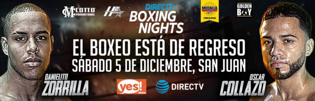 DANIELITO ZORRILLA Y OSCAR COLLAZO TRAEN EL BOXEO DE VUELTA A PUERTO RICO PRIMER EVENTO DE BOXEO EN PUERTO RICO DURANTE LA PANDEMIA Caguas, PUERTO RICO – Luego de nueve largos meses de inactividad forzada debido a la pandemia del COVID-19, el boxeo finalmente hará su regreso en Puerto Rico y por DIRECTV; cuando Miguel Cotto Promotions, H2 Entertainment junto a Golden Boy Promotions presenten su cartel en el coliseíto Pedrín Zorrilla de San Juan el próximo 5 de diciembre con una velada estelarizada por el invicto monarca súper ligero NABO, Danielito ‘El Zorro’ Zorrilla, así como la segunda pelea profesional del medallista de oro panamericano en el peso minimosca Oscar Collazo. La cartelera se confirmó la semana pasada luego de árduas negociaciones con el gobierno de Puerto Rico por los pasados meses para obtener la permisología necesaria par poder efectuar un evento boxístico, aunque fuese sin fanáticos en las gradas y con exclusividad de transmisión para DIRECTV en Puerto Rico. “Estamos súper contentos que nos dieron el permiso para presentar carteleras de boxeo en Puerto Rico, aunque sea sin fanáticos luego de varios meses de negociaciones con el secretario del Departamento de Salud, Lorenzo González, la secretaria del Departamento de Recreación y Deportes, Adriana Sánchez Parés, y al presidente de la Comisión de Boxeo, Luvi Callejas, a quien agardecemos por toda la ayuda para conseguir que el boxeo volviera a presentarse en Puerto Rico”, dijo Héctor Soto, vicepresidente de la empresa. “Y queremos hacer nuestro regreso en grande al contar con dos de los mejores prospectos de Puerto Rico en acción, como lo son Danielito Zorrilla y Oscar Collazo y en exclusivo por el canal 161 OnDIRECTV”. “Nos entusiasma que la acción del boxeo local tenga su gran regreso de forma exclusiva por DIRECTV. Reanudamos nuestro compromiso con el deporte y su fanaticada de manera responsable y cumpliendo con los nuevos protocolos de seguridad. Si bien los tiempos han cambiado, el seguir difundiendo eventos locales nos permite diferenciarnos llevando a todos los hogares el mejor entretenimiento” comentó Belkys Mata, AVP Sales Operations de DIRECTV Puerto Rico. El prometedor y estrella en ascenso ‘El Zorro’ Zorrilla (13-0 10 KO’s) no pelea desde el 5 de octubre del 2019 cuando noqueó al azteca José Antonio Pere Campos (23-2) para conquistar el título interino súper ligero NABO, mientras que Collazo (1-0 con 1 KO) no combate desde el 15 de febrero de este año cuando debutó de forma exitosa como professional tras noquear al mexicano Vicente Castro (1-4-2).