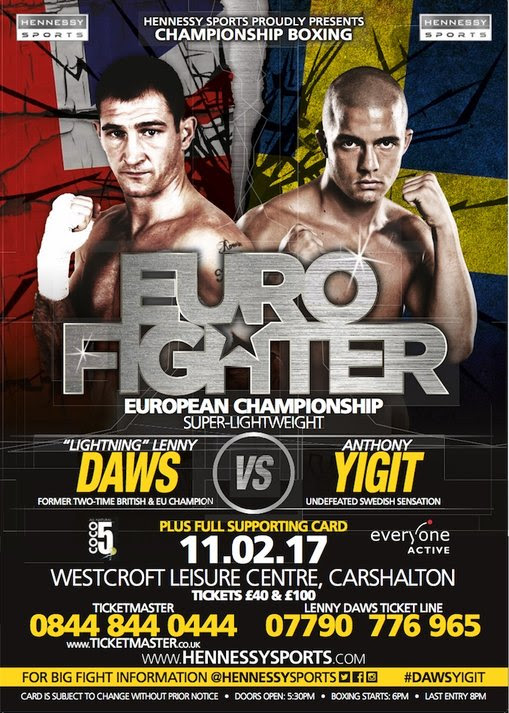 LONDON (3 January 2017) Tickets are now on sale for Lenny Daws’ EBU European Super-Lightweight title showdown against Anthony Yigit for the rescheduled date of Saturday 11th February at the Westcroft Leisure Centre, Carshalton.