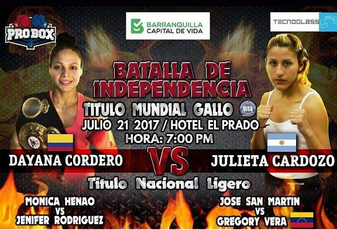 Una de las dos campeonas con que cuenta Colombia, del municipio de Caucasia, Dayana Cordero, residente en el vecino país de Panamá, será la atracción principal en la cartelera que se avecina para este 21 de julio en el imponente y legendario hotel El Prado, de Barranquilla, defendiendo por segunda vez su interinato del peso gallo versión Asociación Mundial de Boxeo (AMB).  La velada es organizada por Probox del Caribe, de Juan Carlos Devia, quien quiere celebrar su segunda década de fundación con incentivos para los asistentes al espectáculo denominado “Batalla de la Independencia”.