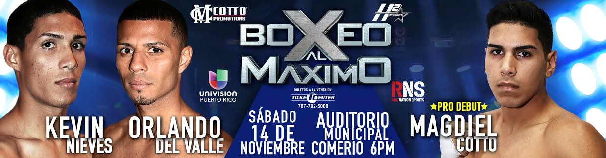 En total, el programa constará de nueve combates, e incluirá el debut como profesional del tambien comerieño Magdiel Cotto, quien representó a Puerto Rico en los pasados Juegos Panamericanos. Cotto estará rivalizando a cuatro asaltos y en las 160 libras con el carolinense Heriberto Salamán.