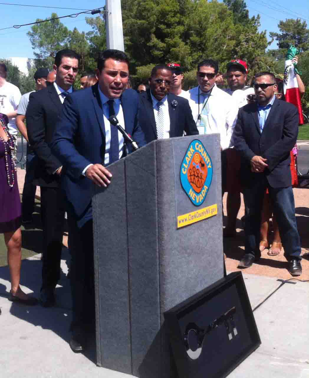 La leyenda del pugilismo y presidente de Golden Boy Promotions, el empresario Óscar De La Hoya quien durante su exitosa y larga trayectoria como profesional fue el pugilista mejor pagado de la historia (récord que aún ostenta) y que junto con Mike Tyson y Julio César Chávez ha sido el boxeador que más público y turismo ha traído a la ciudad del entretenimiento. El fundador y presidente de Golden Boy Promotions fue reconocido por las autoridades de Las Vegas esta calurosa tarde sábado 13 de Septiembre, en lo que ha sido declarado “El día de Óscar De La Hoya” así lo proclamó el senador del estado de Nevada Rubén Kihuena y el comisionado del Condado de Clark, Lawrence Weekly.