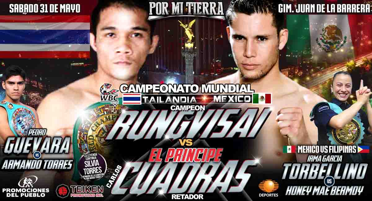 En la velada que organizan Promociones del Pueblo, el empresario Salvador Briman y Teiken Promotions, el mexicano Cuadras buscará el título mundial supermosca del Consejo Mundial de Boxeo, que actualmente ostenta el asiático; además de la presencia de la habilidosa zurda Irma “Torbellino” García; el campeón mundial Plata del CMB, el mazatleco Pedro Guevara, el clasificado mundial Saúl “Baby” Juárez, además del explosivo choque de revancha entre los capitalinos Giovanni “Lloviznas” Delgado y Roberto “Escorpión” Pucheta en peso gallo.