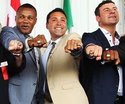 San Juan, PUERTO RICO – Los ex campeones mundiales de la Organización Mundial de Boxeo (OMB) y exaltados al Salón de la Fama del Boxeo Internacional en 2014, Joe Calzaghe -derecha- y Oscar de la Hoya -centro- (junto al ex triple campeón Félix ‘Tito’ Trinidad), serán honrados durante la 27ma Convención Anual de la OMB, que se efectuará del 27 al 31 de octubre en el Caesar’s Palace de Las Vegas.