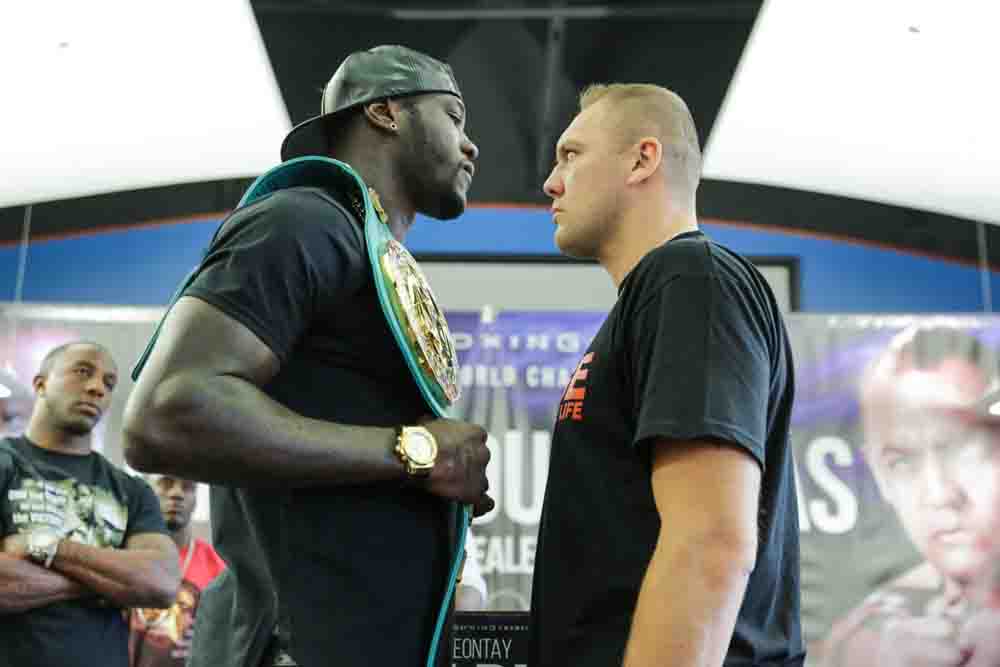 BIRMINGHAM, AL (September 24, 2015) – Heavyweight world champion Deontay “The Bronze Bomber” Wilder and French heavyweight Johann “Reptile” Duhaupas faced-off for the first time Thursday before they enter the ring for Premier Boxing Champions (PBC) on NBC Saturday, September 26 from the Legacy Arena in Birmingham, Alabama.