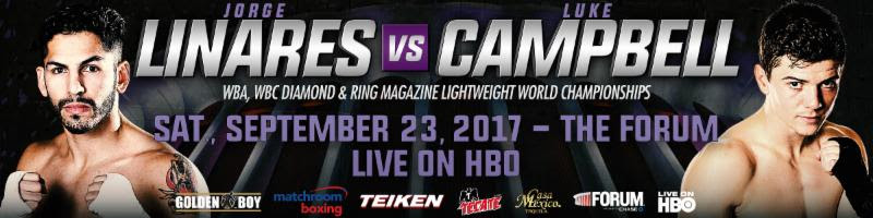 Linares vs. Campbell es un combate a 12 asaltos por los cintos mundial ligero AMB, Diamante CMB y Ring Magazine que se efectuará el sábado 23 de septiembre desde el ‘Fabuloso’ Forum de Inglewood, California y es presentado por Golden Boy Promotions y Matchroom Boxing en asociación con Teiken Promotions. Orozco vs. Ortiz es un duelo a 10 asaltos por el cetro superligero USNBC versión CMB presentando por Golden Boy Promotions en asociación con Cancun Boxing. El evento es patrocinado por Tecate, BORN BOLD, Casa México Tequila, Thor: Ragnarok y Fred Loya Insurance, y será televisado en vivo por HBO World Championship Boxing comenzando a las 10:00 p.m. ET/PT. El respaldo no televisado de Linares vs. Campbell será transmitido por RingTV.com empezando a las 3:00 p.m. PT/ 6:00 p.m. ET.
