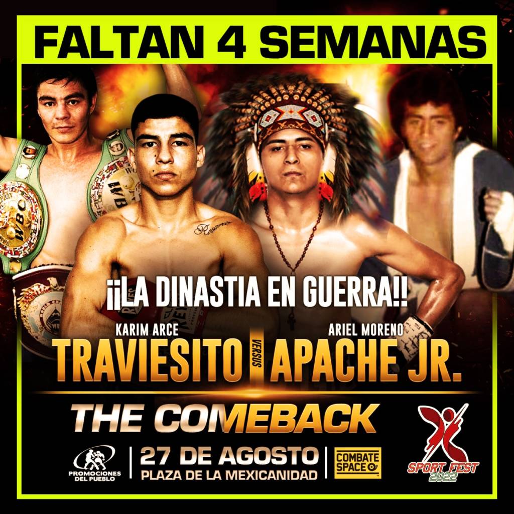 Dos jóvenes talentos en cuyas venas corre el boxeo, se verán las caras el próximo sábado 27 de agosto en la Plaza de la Mexicanidad de Ciudad Juárez; se trata del mochitense Karim ‘Traviesito’ Arce y el juarense Ariel ‘Apache’ Moreno Jr., quienes protagonizarán un duelo de poder a poder.