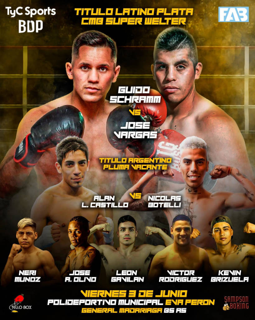 ARGENTINA ‐ El ascendente bonaerense Guido Schramm enfrentará al chubutense José Vargas, por el título latino plata WBC súper welter, y el cordobés Alan Lúques Castillo lo hará ante el salteño Nicolás Botelli estando en disputa el cetro nacional pluma vacante, en un doble fondo excepcional a realizarse este viernes 3 de junio en el Polideportivo Municipal Eva Perón, de General Madariaga, Provincia de Buenos Aires, en otra promoción de Sampson Boxing y Tello Box.
