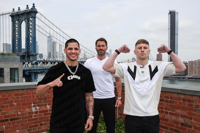 Edgar Berlanga (izquierda) posa con el puente de Brooklyn a sus espaldas, junto a su rival de este sábado, el irlandés Jason Quigley, y con su nuevo promotor Eddie Hearn, al centro. (Melina Pizano/Matchroom.)