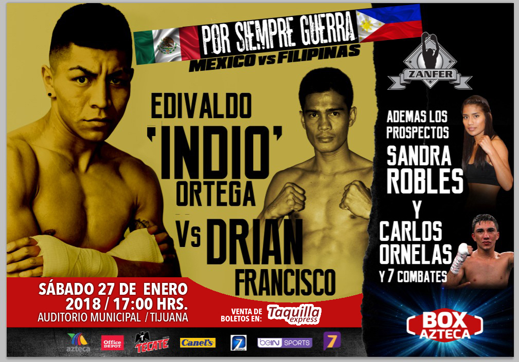 “Indio” Ortega (25-1-1, 12 ko’s) y “Gintong” Francisco (29-4-1, 22 ko’s) encabezarán la función que presentará Zanfer este sábado, en el Auditorio Municipal de Tijuana, y que será transmitida por la Casa del Boxeo, Azteca 7.