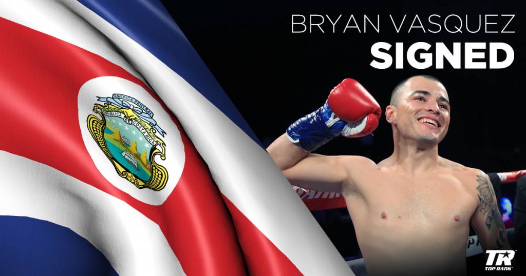 LAS VEGAS – Top Rank ha firmado al ex dos-veces campeón interino superpluma de la AMB Bryan Vasquez a un contrato promocional, anunció hoy Bob Arum. Vásquez (37-3, 20 KOs), de San José, Costa Rica, tiene 30 años y ha estado peleando en el nivel mundial durante casi una década. Su debut bajo el banderín de Top Rank se anunciará pronto.