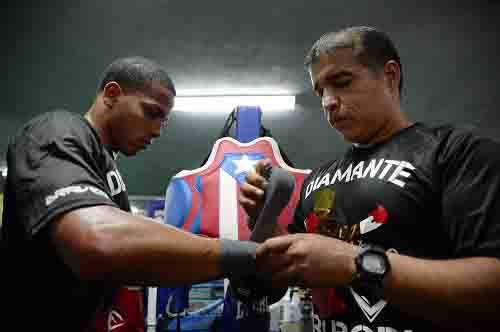 06/1/15. SAN JUAN, PR. ENTRENAMIENTO PUBLICO DEL CAMPEON LATINO LIGERO DE LAS 135 LIBRAS DE LA ORGANIZACION MUNDIAL DE BOXEO FELIX EL DIAMANTE VERDEJO, EN PREPARACION PARA SU PROXIMO COMBATE EL SABADO 13 DE JUNIO EN EL MADISON SQUARE GARDEN DE NUEVA YORK ANTE EL MEXICANO IVAN NAJERA, LLEVADO A CABO EN EL GIMNASIO EL DIAMANTE DE CUPEY. EN LA DERECHA RICKY MARQUEZ, ENTRENADOR DE FELIX VERDEJO. (CARLOS GIUSTI/EL VOCERO)