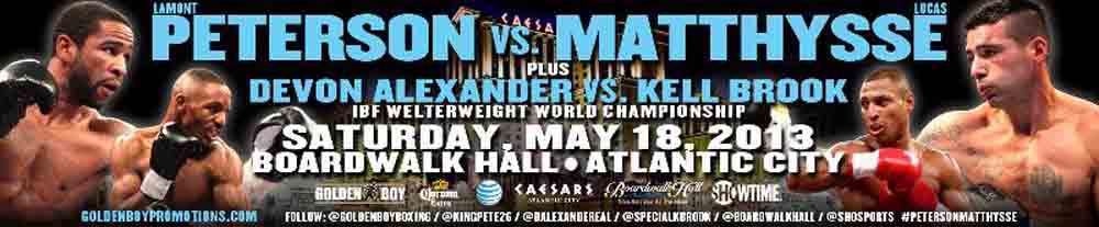 Peterson vs. Matthysse es presentado por Golden Boy Promotions y patrocinado por Caesars Atlantic City, Corona y AT&T, y será transmitido en vivo por SHOWTIME a las 9:15 p.m. ET/PT (diferido en la Costa Oeste), después del epilogo de TODO ACCESO: MAYWEATHER vs. GUERRERO que será transmitido a las 9:00 p.m. ET/PT.Devon Alexander se mide a Lee Purdy en el duelo co estelar por el cetro mundial welter de la Federación Internacional de Boxeo (IBF por sus siglas en inglés) en poder de Alexander. SHOWTIME CHAMPIONSHIP BOXING esta disponible en español en la programación de audio secundario (SAP por sus siglas en inglés).