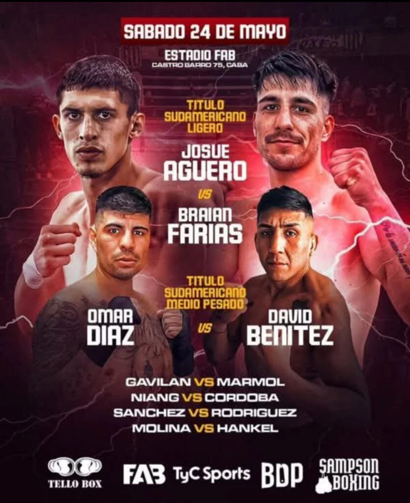 El catamarqueño Josué Aguero, uno de los mayores prospectos boxísticos argentinos, defenderá este sábado 24 de mayo su récord invicto e irá por el título sudamericano ligero vacante, frente al duro bonaerense Brian Farías, en el pleito principal de la función a realizarse en el estadio de la Federación Argentina de Box (FAB), en la Ciudad Autónoma de Buenos Aires, en otra producción de Sampson Boxing y Tello Box, con televisación de TyC Sports, desde las 22:30.