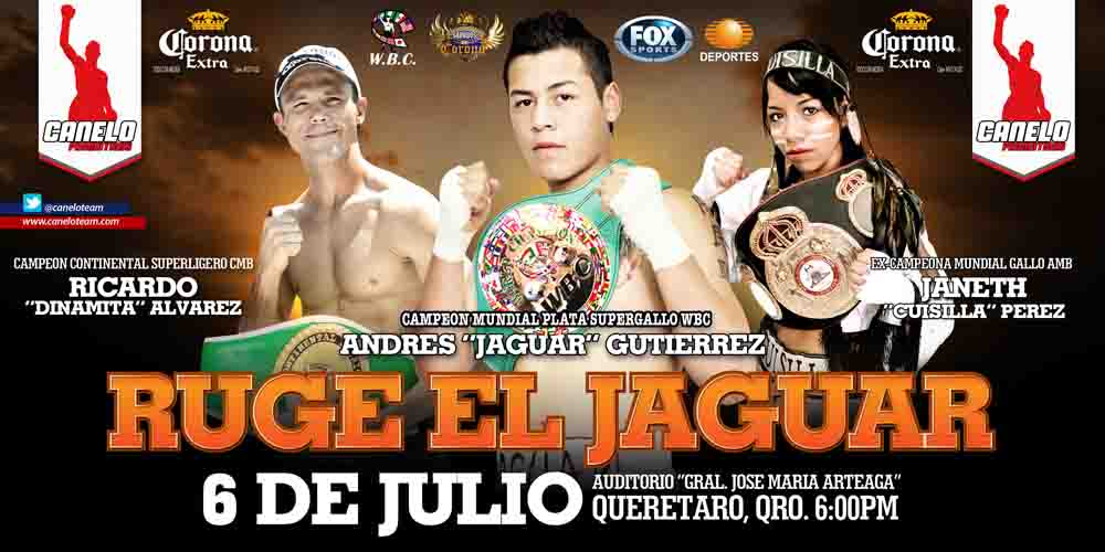 En medio de un gran ambiente se anunció hoy la cartelera boxística que protagonizarán los explosivos Andrés “Jaguar”Gutiérrez, Ricardo “Dinamita” Álvarez y Janeth “Cuisilla” Pérez, el sábado 6 de julio en Querétaro, Qro.