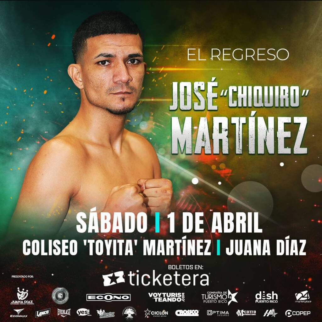 Caguas, PUERTO RICO – El contendor y experimentado peleador del pueblo de Las Marías, Puerto Rico José “Chiquiro” Martínez (21-2-3, 14KOs), estará de regreso el sábado 1 de abril en Coliseo Dolores ‘Toyita’ Martínez en Juana Díaz peleando a 8 asaltos en la división gallo. ‘Chiquiro’ buscará la ruta ganadora luego de sufrir un sorpresivo revés el pasado 19 de agosto ante el veterano Carlos ‘Chocorroncito’ Buitrago.