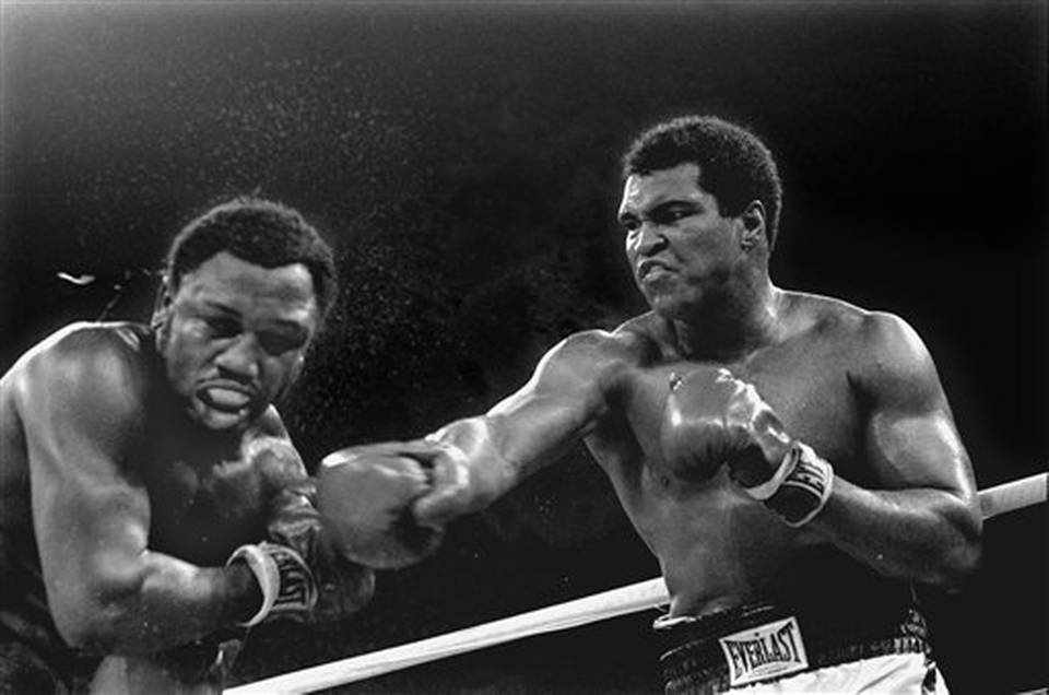 En esta imagen, tomada el 1 de octubre de 1975, el campeón de los pesos pesados, Muhammad Ali, conecta un golpe de derechas contra su rival por el título Joe Frazier en el noveno asalto de una pelea por el título en Manila, Filipinas. Ali falleció el 3 de junio de 2016. Tenía 74 años. Mitsunori Chigita AP Foto