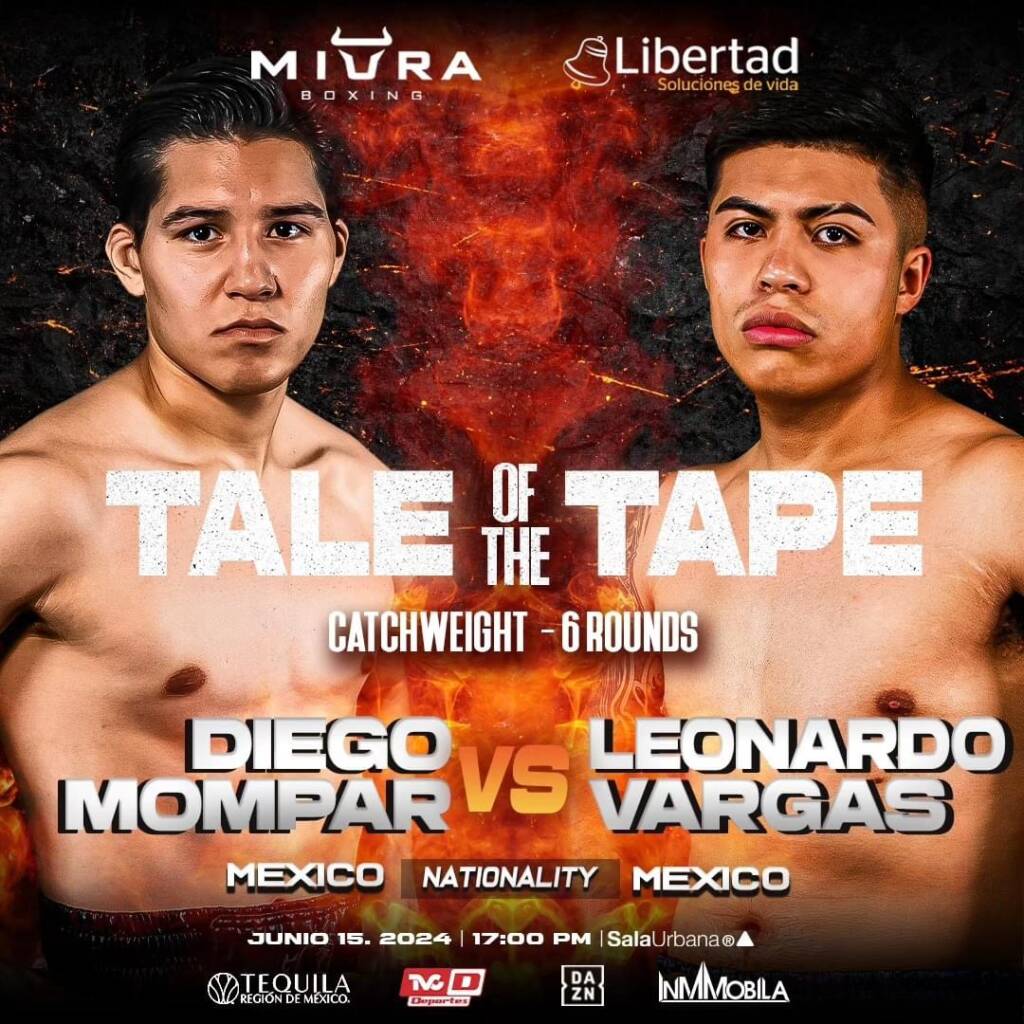 Al conformar el respaldo de la cartela que ofrece Miura Boxing, que encabeza Manuel Garrido, y que es posible gracias al apoyo de apoyo de Libertad Soluciones de Vida, Tequila Región de México e Inmmobila, Diego ‘Gallo’ Mompar (7-2-2, 3 Ko’s) vuelve a los encordados para encarar a un aguerrido oponente como lo Leonardo Vargas (8-2-0, 1 Ko’s), en combate que promete estar repleto de emociones gracias a la energía y pundonor que imprimen en cada uno de sus compromisos este par de guerreros.